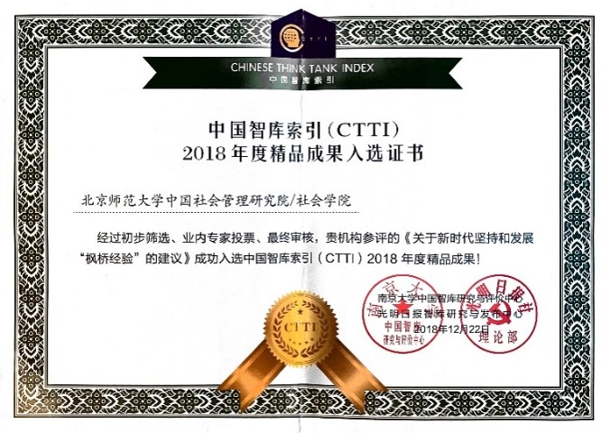 图片2:《关于新时代坚持和发展“枫桥经验”的建议》荣获中国智库索引(CTTI)“2018年度精品成果奖”