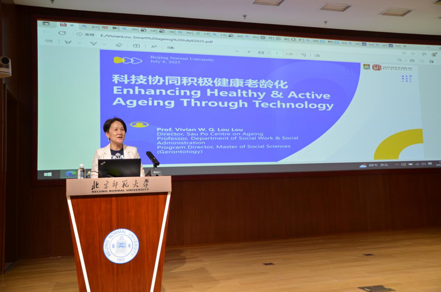 在开营仪式上,香港大学秀圃老年研究中心总监、香港大学社会工作及社会行政学系教授楼玮群为营员们带来了“科技协同积极健康老龄化”主题讲座。楼教授指出,全球可持续发展面临人口结构变化等四大挑战,而人口结构变化为积极健康老龄化提供契机,科技发展亦带来新可能,分析了老年人接受科技的影响因素、技术采纳的挑战及成功实施的条件,呼吁通过以用户为本的设计和共建支持环境推动积极健康老龄化。讲座深入探讨了科技与人口结构变化的关联,为应对老龄化问题提供了兼具理论与实践价值的思路。讲座后,同学们积极思考、踊跃交流,在“科技助老”、农村地区数字鸿沟等方面探讨了有意义的问题,获得了宝贵的指导和启发。必威betway西汉姆付媛媛副教授出席了本场讲座。